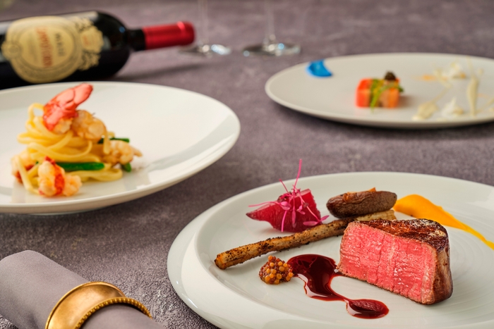 ディナーメニューは、季節ごとに内容が変わるコースをご用意。秋のオススメは、 「Anniversario(アニバサリオ)」。大聖堂のステンドグラスをイメージした前菜、シェフ自慢のスペシャリテ・オマール海老のレモンクリームパスタをはじめ、国産牛フィレ肉やトリュフなどの高級食材をふんだんに使用した秋らしい全6皿のイタリアンフルコースをお楽しみください。