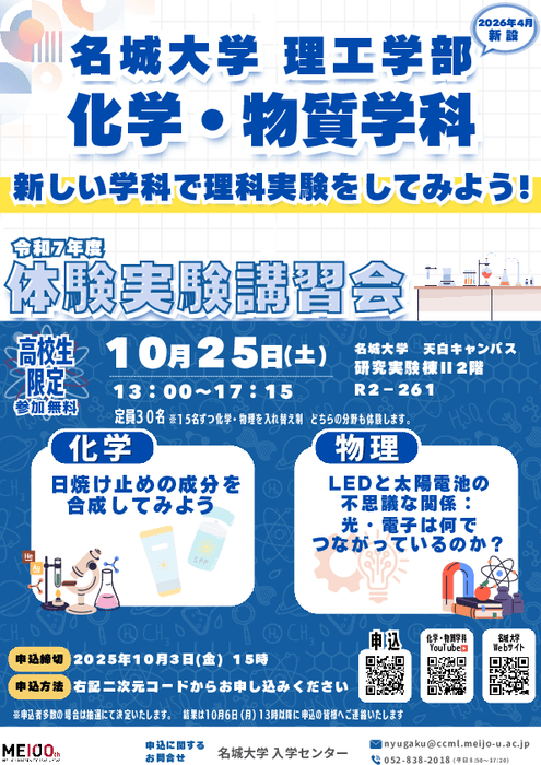 10月25日(土)に名城大学天白キャンパスで理工学部 化学・物質学科主催の体験実験講習会を開催します。