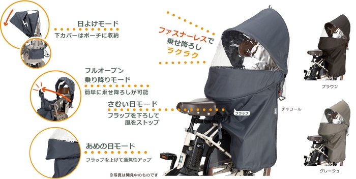上カバーは、雨天・防寒・日よけ・乗り降りの4つのモードに変更できます。フラップ付きで、上げれば通気性が良くなり雨の日も窓が曇りにくく、下げれば寒い日の隙間風を防ぎます。日差しをカットするサンシェードとしても活躍し、フルオープンでも走行できます。雨や寒さから足元を守る下カバーは、簡単に着脱でき付属のポーチに収納しておくことも可能です。装着したままでも左右に大きくスイング開放でき、子どもの乗せ降ろしはスピーディにできます。さらにファスナーレスを実現し、レインカバーの開け閉めが非常に簡単になりました。上カバーは中からでも開けられ、緊急脱出性にも優れています。