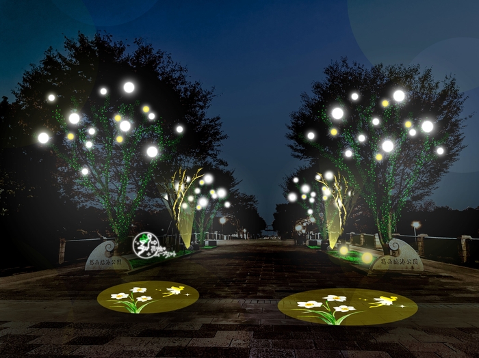 公園のエントランスでは、スイセンの花や茎をイメージして、樹木を白色や黄色、緑色のライトで装飾する他、園路にスイセンの画像を投影する等の演出を行い、公園入口からワクワク感を演出します。エントランスからスイセン畑に向かう園路では、光が皆様をスイセンまで誘う演出をお楽しみいただけます。