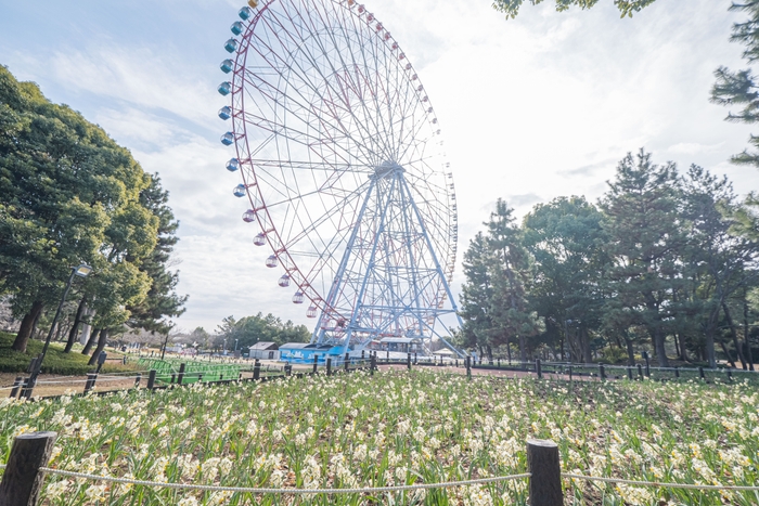 葛西臨海公園のスイセン畑は、静岡県下田市、福井県福井市、千葉県鋸南町、兵庫県洲本市のスイセンの名所から集まったスイセン、およそ20万輪が咲き誇る都立公園最大のスイセン畑です。大観覧車を背景に、全体で約5万7千球のスイセンが咲き誇る様子は圧巻です。