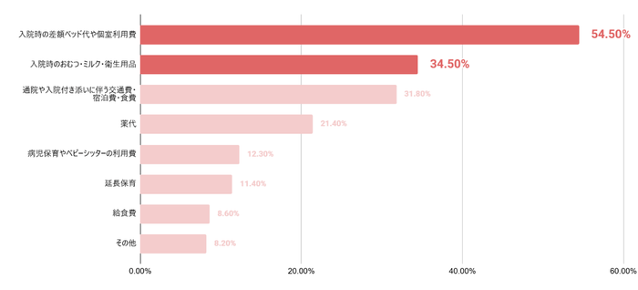 さらに、上記質問で「はい、あった」と回答した人を対象に、『助成金や制度でカバーしきれなかった費用として、当てはまるものをすべてお選びください(複数回答可)』と尋ねた結果、その内訳としては、差額ベッド代(54.5%)、医療機関への交通費・宿泊費(31.8%)など、助成の対象外となる費用が目立ちました。乳幼児期は「ほとんど医療費はかからない」と思われがちですが、こうした結果からも、公的助成だけではまかないきれない負担が生じている現実が浮き彫りになっています。