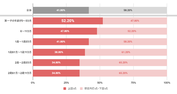 第一子出産後にかかった乳幼児期の医療費について、「想定より高かった」と答えた保護者は41.8%にのぼりました。特に0~5カ月で52.2%と高く、回答時の子どもの年齢が低いほど、想定外コストが発生したと感じる割合が高い結果となりました。
