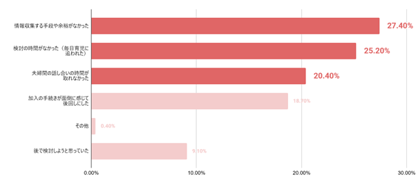 出産後の生活は授乳や夜泣き、健診や予防接種など、日常的に時間と労力を要します。そのため「保障を検討したい気持ちはあっても、実際には動けなかった」という声が目立ちました。調査では、母親の多くが「情報収集の余裕がなかった」(27.4%)、「検討の時間がなかった」(25.2%)、「夫婦間で話し合えなかった」(20.4%)と回答しており、いずれかの理由で加入検討が難しかった人が過半数にのぼりました。