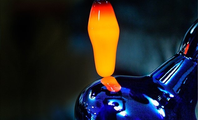 工房では、現代の「びいどろ吹き」である職人さんが、丹精込めてガラスに新しい命を吹き込み、日々創作に励んでいます。工房内には様々な色や形の美しいガラス製品がずらり。瑠璃庵の職人さんは、なんと国宝・大浦天主堂のステンドグラス修復工事を手掛けた他、公共施設などのステンドグラス制作もされています。