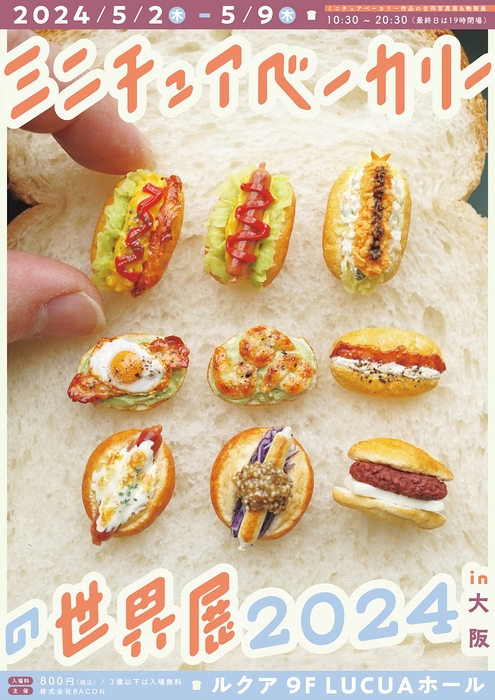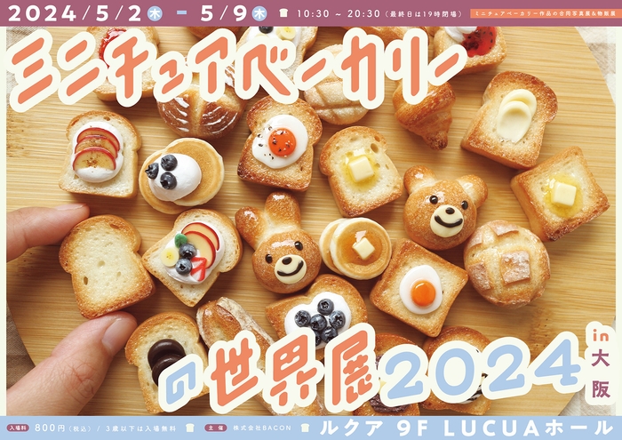株式会社BACON(べーこん)は、パンやスイーツのミニチュアベーカリー作品だけを集めた合同写真展&物販展「ミニチュアベーカリーの世界展 2024 in 大阪」を、ルクア大阪(大阪市梅田)にて2024年5月2日(木)~5月9日(木)に開催します。大阪初公開となる新作の展示から限定グッズなど、過去最大規模となるミニチュアの祭典をお届けします!先着2,000名には、オリジナルポストカードの配布も行われますので、お早めに会場へお越しください!
