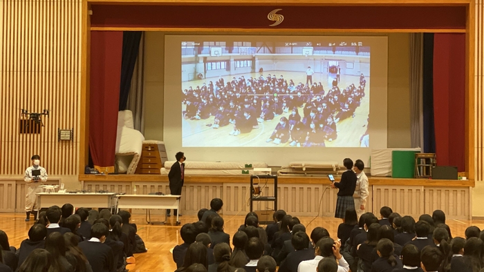 また、リアルグローブの講演後にはイーシーセンターより実際に産業用ドローンのフライトを担当いただき、生徒にはイーシーセンター指導のもとトイドローンを実際に操縦頂きました。