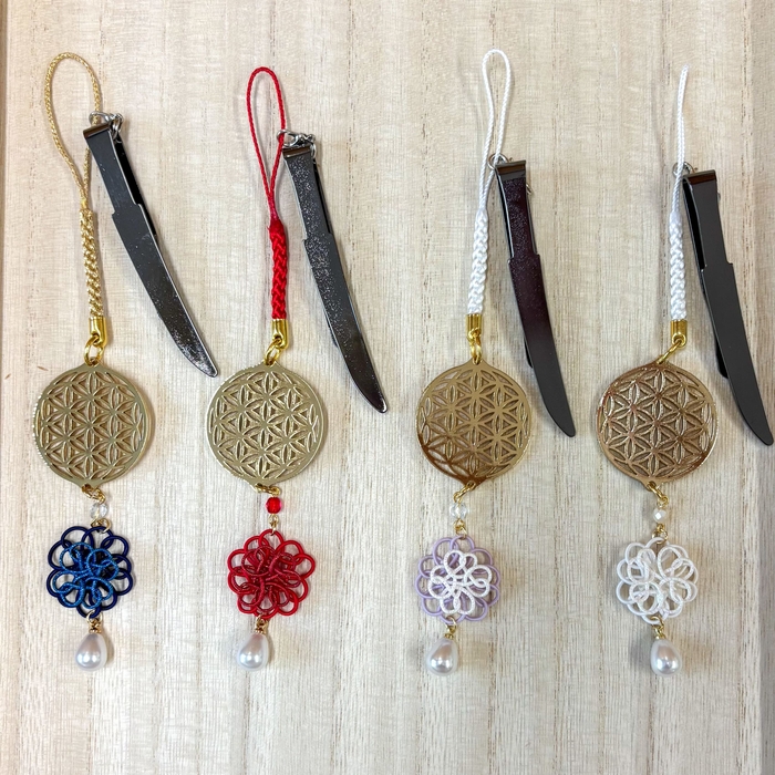 真鍮製の麻の葉デザインのチャームと日本古来から伝わる水引(白・赤・青・紫の4色)を組み合わせた和風のアクセサリーです。刀型のクリップ付きで、和装・バック・スーツ等に付けてアクセサリーとして、また、お部屋の飾りとしてお楽しみください。