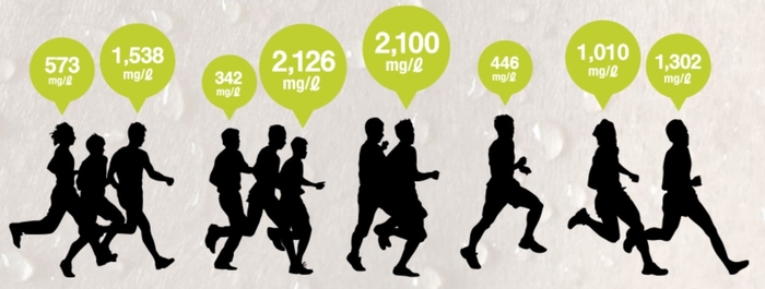 バース大学でスポーツおよび運動科学の理学士の学位を取得したスポーツ科学者でトップアスリートとしての経験もあるPRECISION Fuel & Hydration CEOのアンディ ブロウ氏が、様々な専門家とともに約15年をかけて開発した、日本で唯一の専用機器を用いて、汗1Lあたりに含まれるナトリウムの含有量を計測します。そして、計測した数値をもとに1時間あたりに消費する汗の量から必要な接種ナトリウム量を算出。このナトリウム含有量はほぼ変わらない数値といわれています。そしてこの数値は個人差が非常に大きく、約12倍もの差があります。