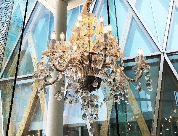 室内を飾るシャンデリアは、文芸学部文化デザイン学科教授 岡本 清文ゼミ(空間デザインゼミ)と錦城護謨株式会社(大阪府八尾市)、株式会社松下工作所(大阪府東大阪市)が共同制作しました。ペットボトルやうどんのプラスチックカップ、卵のケースなど身の回りにあるものを型にして、錦城護謨株式会社開発の高透明シリコーンゴムでパーツを作りました。廃材をアップサイクルしたパーツと、既製品のホースなどを組み合わせて組み上げることで、制作コストや重量を抑えた、美しいエコシャンデリアが完成しました。