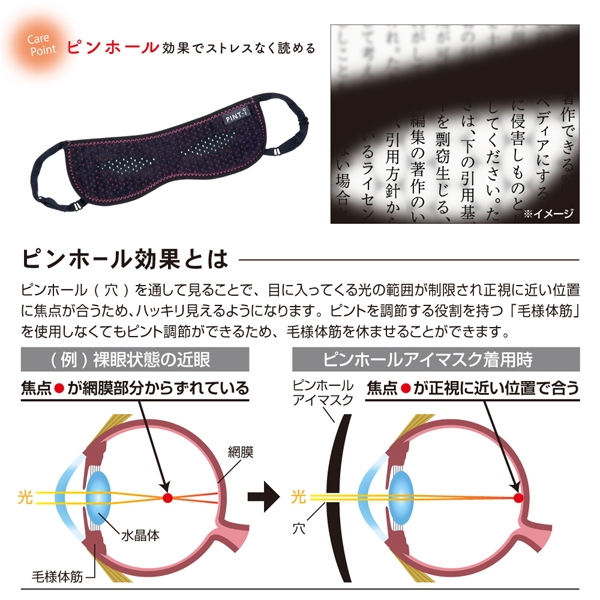 ピンホール(穴)を通して見ることで、目に入ってくる光の範囲が制限された正視に近い位置に焦点が合うため、ハッキリ見えるようになります。
