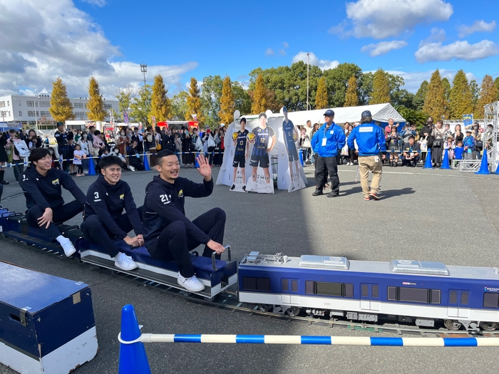 12月7日(土)は、当日観戦されるお客さま全員に試合観戦特典として オリジナルデザインのステッカーやトートバッグなどをプレゼントするほか、抽選で京阪グループの賞品が当たるセット間イベントなどを実施します。また、12月7日(土)・8日(日)の2日間にわたり、アリーナ場外でオリジナルデザインの「重ね捺しスタンプラリー」や、昨年ご好評いただいた「3000系ミニ電車」の運転をはじめとする「京阪ブース」を出展します。会場内外でお客さまにお楽しみいただけるよう、様々な企画をご用意しています。