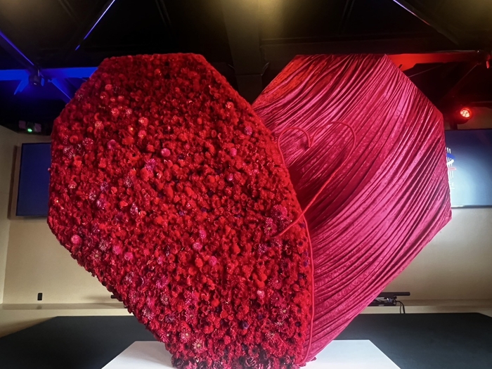 ハート型オブジェの左右で異なる素材を用いた象徴的な造形。 片側は生花で命の息吹と感情の豊かさを表現、もう片側はベロア素材のドレープで優雅さと深みを演出。赤い糸のオーナメントをハートの中心を貫くように配置し、「つながり」や「運命」を視覚化。来場者に作品を通して“見る・感じる・撮る”体験を提供し、記憶に残る演出に。