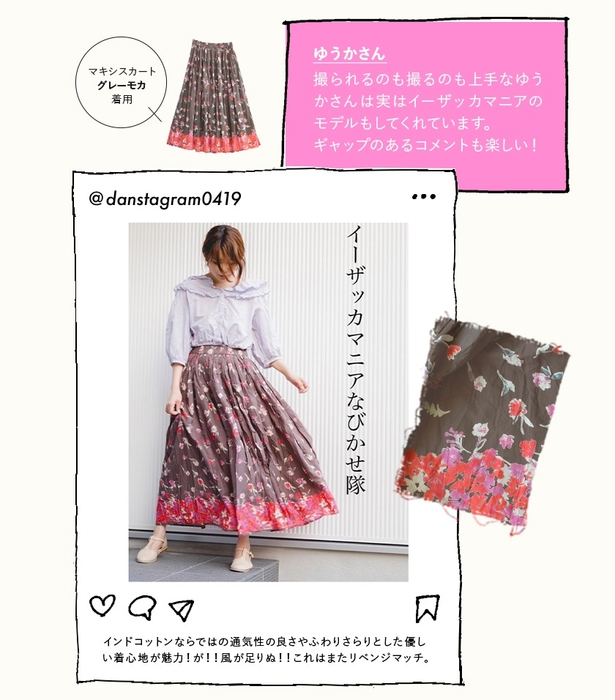 特集ページには、これからの夏を彩り、快適に過ごしていただけるスカートを中心にその魅力を見た目でも楽しくお伝えするべく「#イーザッカマニアなびかせ隊」をキャッチコピーにして、フレンズのみなさまやイーザッカマニアスタッフのコーディネートと共にご紹介しております。