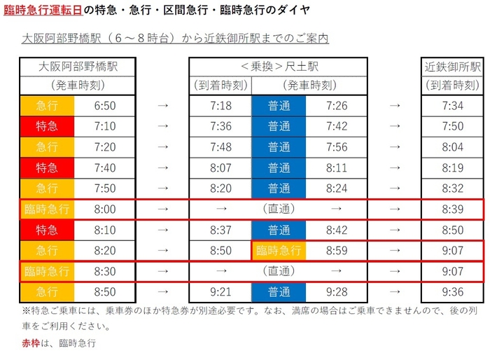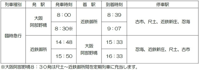 各日、大阪阿部野橋駅発・近鉄御所駅行き2列車、近鉄御所駅発・大阪阿部野橋駅行き2列車の計4列車を増便します。※臨時列車は近鉄御所駅で奈良交通の葛城ロープウェイ前行き臨時バスと連絡しています。