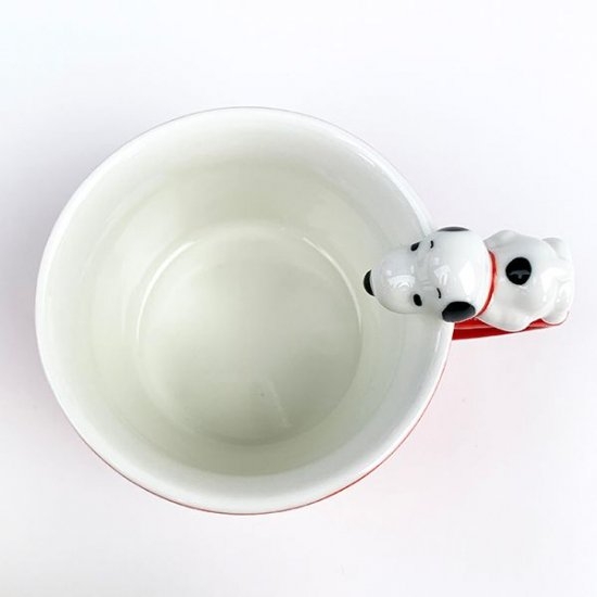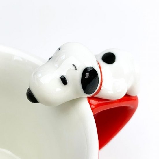 真っ赤なカラーのマグカップにSNOOPYのロゴが入ったシンプルなデザインです。そこにかわいさをプラスしてくれているのが、持ち手の上部に乗っかったスヌーピーのフィギュア♡