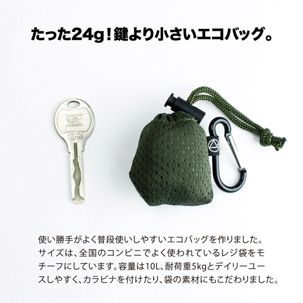容量は10L、耐荷重5kgとデイリーユースしやすく、カラビナを付けたり、袋の素材にもこだわりました。