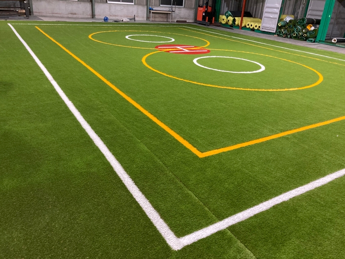 施工期間は約二週間ほど。屋内だけでなく屋外にも施工可能。芝のクッション性が機体に優しく、またラインは通常の人工芝に色を塗った物ではなく、