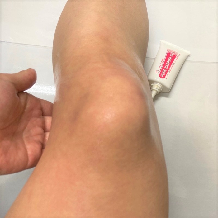②膝周りの場合、パール大を目安に塗ってください