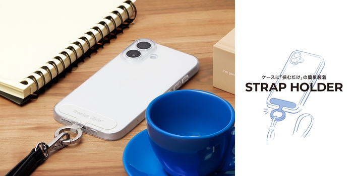 端末とケースの間にストラップホルダーを挟み込むだけで、ストラップホールを付加します。